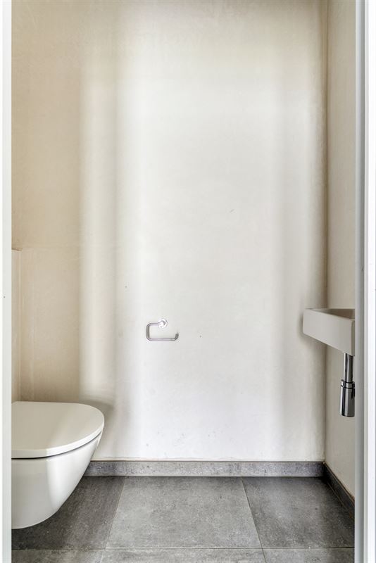 Op het gelijkvloers bevindt zich een inkomhal met gastentoilet en een beuken trap naar de verdieping. De lichtrijke living van 35 m² met hoog plafond en grote ramen geeft een bijzonder ruimtelijk gevoel. Aansluitend vindt u een open keuken van 13 m² met kookeiland, volledig uitgerust met hoogwaardige AEG-toestellen. Verder is er een praktische wasplaats en een inpandige garage met automatische sectionale poort. Voor wie extra parkeercomfort wenst, is het bijbouwen van een carport reeds vergund.