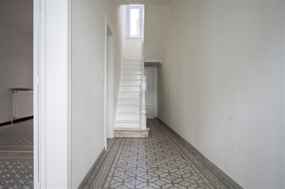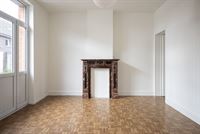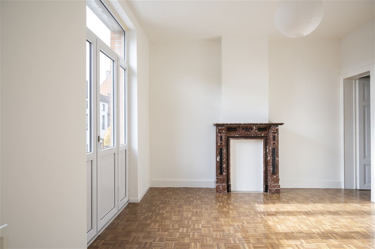 In de living springt het authentieke vloertje, de hoge plafonds en de mooie schouw onmiddellijk in het oog.