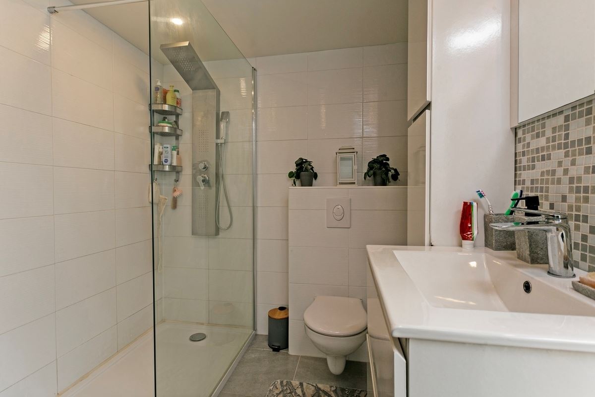 Inkomhal, gezellige living met eetplaats, keuken, badkamer ( inloopdouche, toilet, lavabo), veranda en berging.