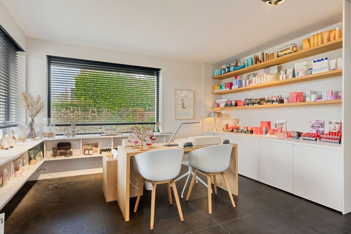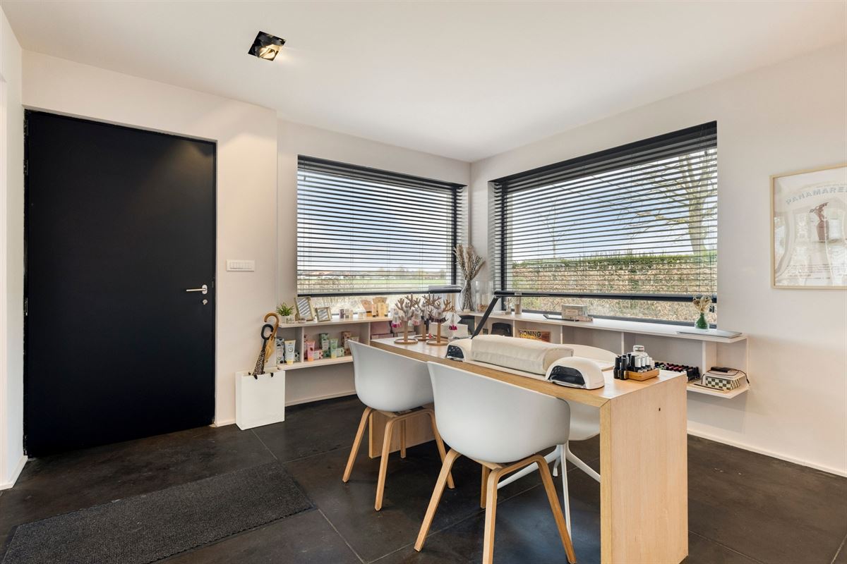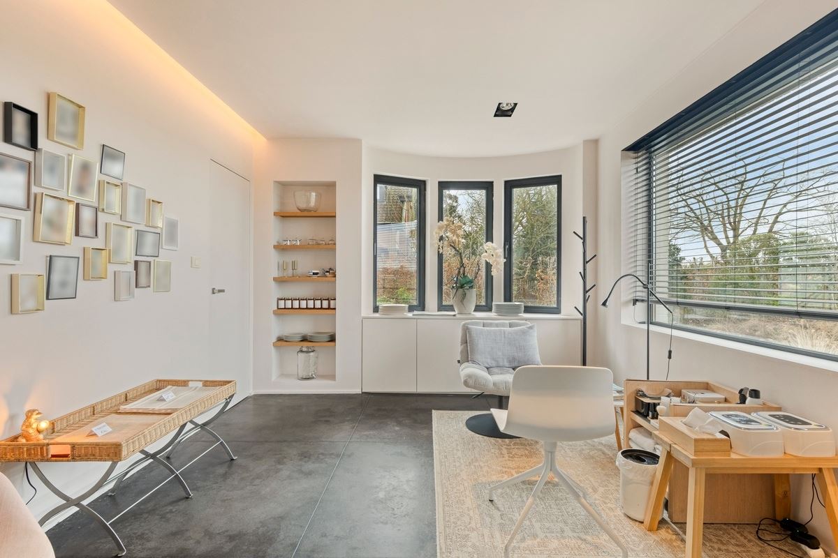 De woning biedt op het gelijkvloers een wachtzaal en een aparte bureelruimte (met aparte ingang), ideaal voor zelfstandigen, vrije beroepen of wie comfortabel van thuis uit wil werken en/of klanten wil ontvangen. Aansluitend bevindt zich een ruime en lichtrijke leefruimte met een volledig uitgeruste open keuken voorzien van teppanyaki, oven, stoomoven, koelkast, vaatwasmachine.. en praktische berging met ingebouwde kasten en diepvries.
