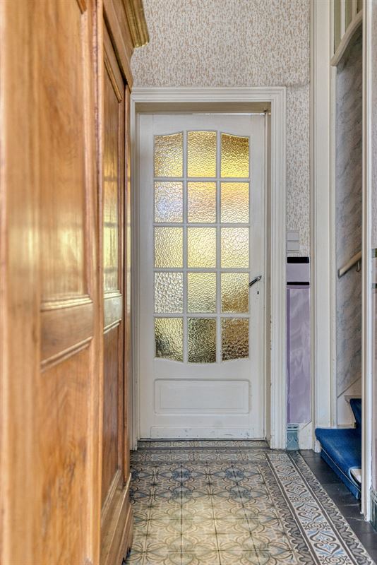 Op de gelijkvloerse verdieping kom je binnen langs de ruime inkomhal met mooie, authentieke tegeltjes.