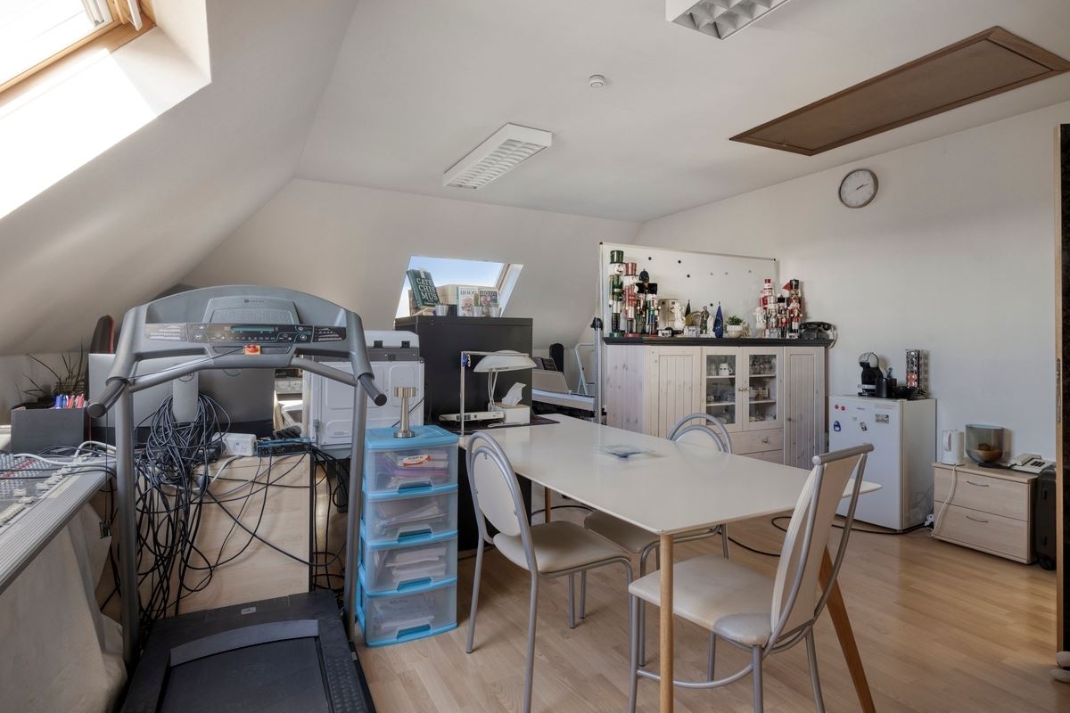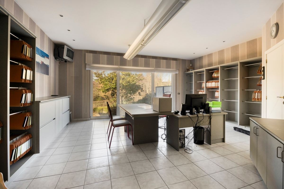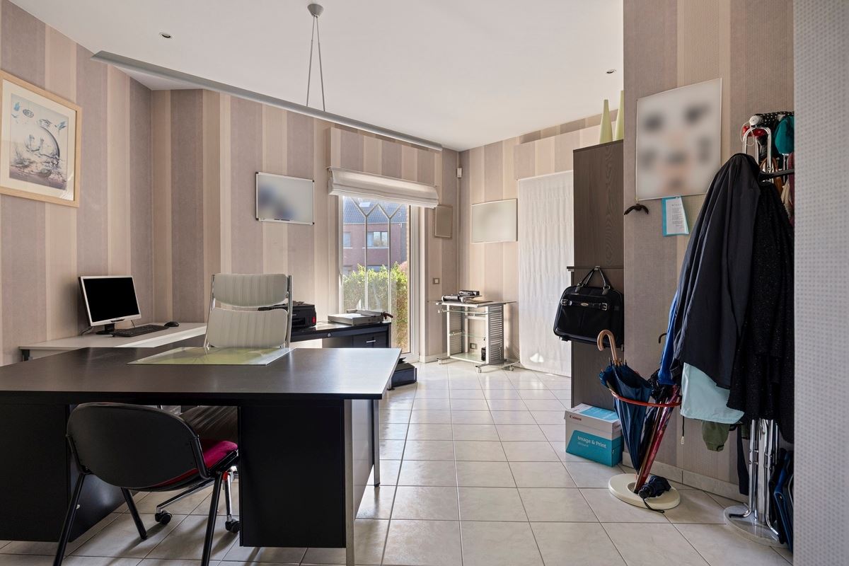 Daarnaast biedt het gelijkvloers meerdere bureelruimtes met een aparte inkomhal, een extra toilet en een wachtzaal perfect voor een zelfstandige activiteit of vrij beroep.